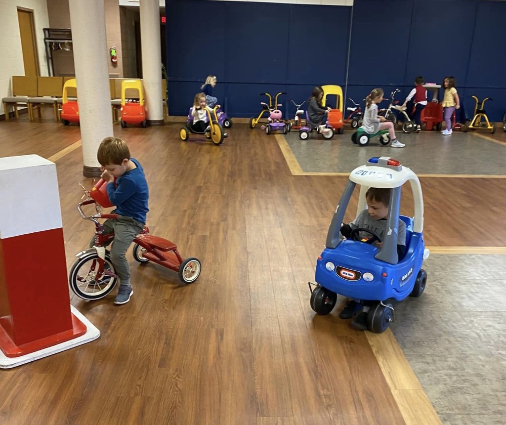 In addition to the classroom, a variety of other play options are offered throughout the year. Our large motor area is available multiple times every month. The children really enjoy driving cars, riding tricycles, balancing on the beam, climbing up and sliding down the slide, playing basketball, and more.